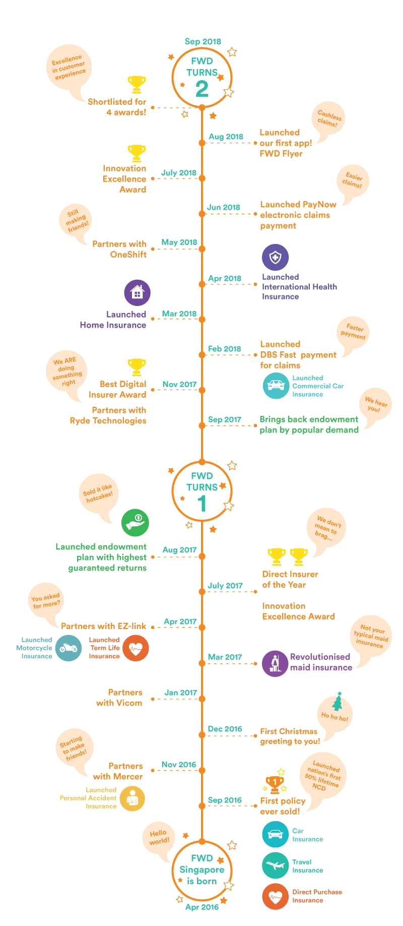 We’re here to challenge everything about insurance and put our customers at the centre of what we do. Over the past two years, we’ve made our “baby steps”, and we’ve received phenomenal support from all of you. You’ve seen us grow, and we’ve had a few speed bumps along the road, but here we are now, two years, 200 awesome employees and counting. A picture paints a thousand words, so we’ve drawn our journey for you, here are our two years in Singapore.