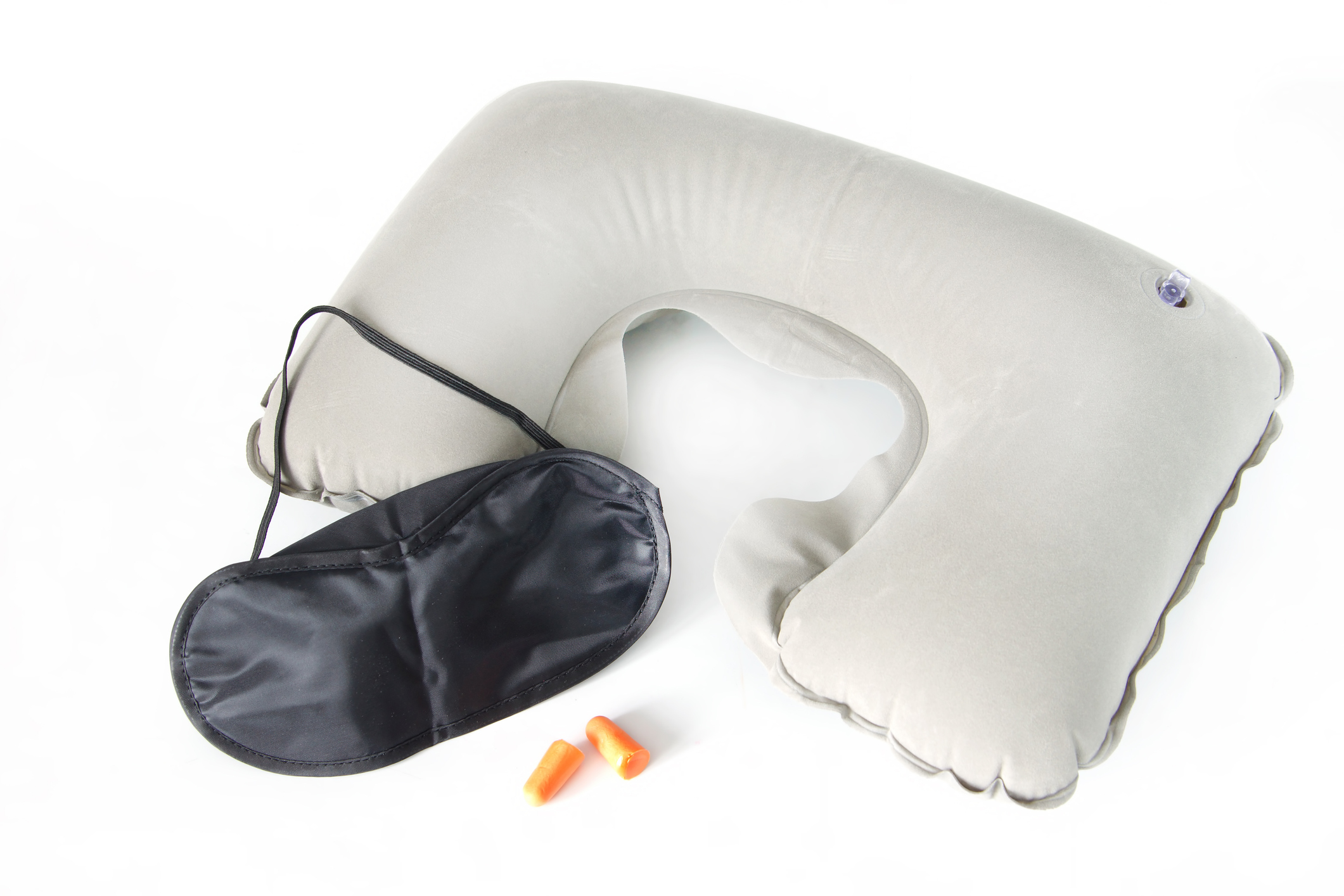 Set for travelling. Inflatable neck pillow with eye mask and earbuds