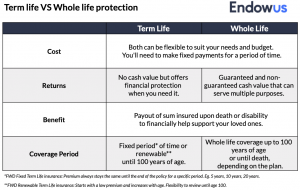 The key differentiator between term life and whole life insurance products lies in its investment function. For term life, there are no returns besides its coverage. For whole life insurance, returns can come in the form of cash value or sometimes dividend payouts, subjected to the performance of the insurer’s investments. These policies have a guaranteed and non-guaranteed component that is stated in the policy details.