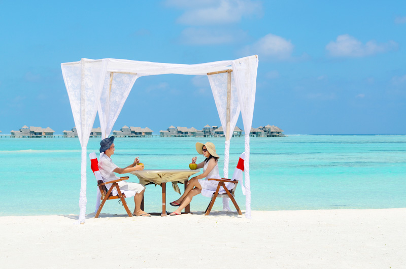 Asian couple in sunhat enjoying romantic luxury lunch setting at tropical beach in Maldives