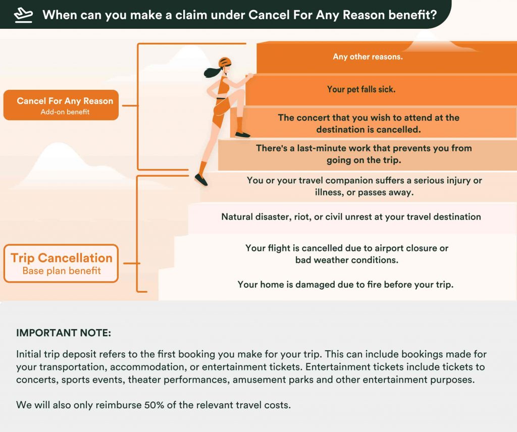 Why is this important? Well, big-ticket items like airfare and accommodation can quickly add up and canceling your travel plan after making bookings and payments could mean taking a hit on the wallet. It’s also a disappointing situation, especially if you’ve been eagerly looking forward to your long-awaited holiday. However, with travel cancellation coverage, you can still salvage a portion of the money you’ve paid, which hopefully makes you feel better about your holiday cancellation.
