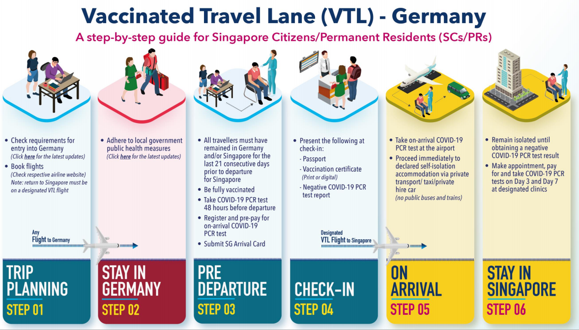 People from Singapore who are fully vaccinated can now use the Vaccinated Travel Lane (VTL) to visit Germany or Brunei without quarantine. A person is considered fully vaccinated two weeks after he or she has received the full regimen of Pfizer-BioNTech/ Comirnaty, Moderna or other vaccines. If you have children under 12 years old who are not eligible for vaccination or family members who are medically unfit to be vaccinated, they will not be able to travel with you under the VTL scheme.